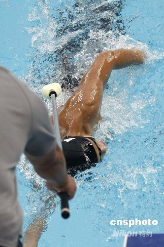 北京2008年殘奧會(huì)游泳S11級(jí)男子400米自由泳預(yù)賽,在北京國(guó)家游泳中心“水立方”進(jìn)行,教練在泳池邊為選手“指路”。中新社發(fā) 盛佳鵬 攝