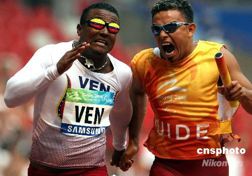北京殘奧會田徑比賽9月16日繼續(xù)在國家體育場“鳥巢”進行,委內瑞拉隊在男子4x100米接力T11-T13級決賽中,以43秒55的成績獲得亞軍。圖為委內瑞拉隊最后一棒選手菲爾南多·菲雷爾在助手的吶喊加油聲中奮力沖向終點。中新社發(fā) 任晨鳴 攝