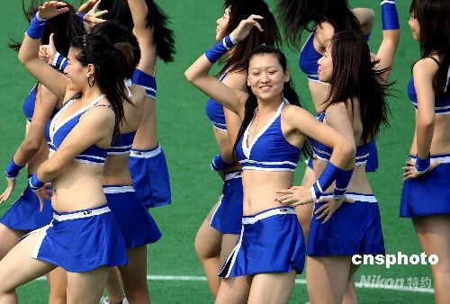 9月17日下午,北京殘奧會五人制足球決賽在北京奧林匹克公園內(nèi)的橄欖球場舉行,中國隊與雅典殘奧會冠軍巴西隊冒著高溫奉獻一場精彩的比賽。比賽間隙,衣著性感的啦啦隊為觀眾奉獻熱舞。 中新社發(fā) 任晨鳴 攝