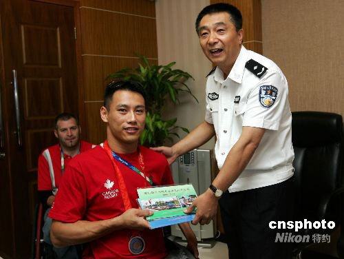 9月18日,一枚失而復(fù)得的北京殘奧會(huì)獎(jiǎng)牌由北京公交民警交還到了加拿大運(yùn)動(dòng)員杰瑞德手中。9月17日晚,加拿大運(yùn)動(dòng)員杰瑞德在乘坐出租車時(shí)不慎將自己的雙肩包遺忘在車上,公交民警接警后,在線索非常有限的條件下,只用了四個(gè)小時(shí),就將背包找回,里面有一枚寶貴的殘奧會(huì)橄欖球銅牌。中新社發(fā) 富田 攝