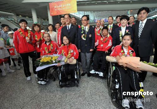 九月十八日,北京殘疾人奧運會中國香港代表團凱旋返港。香港民政事務局局長曾德成前往迎接,并與代表團團長伍澤連及運動員步出機場。中新社發(fā) 鄧慶樂 攝