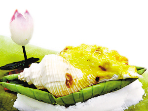 這道菜就是睡蓮花釀響螺。它用螺肉、鮮芡實(shí)、鮮淮山、沙葛及南瓜做餡,釀在響螺殼中焗香。這道菜的材料非常豐富,口感也很有層次。