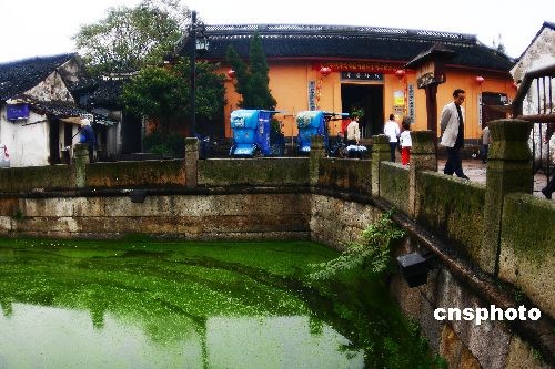 圖:浙江紹興王羲之故宅前墨池遭藍(lán)藻侵襲