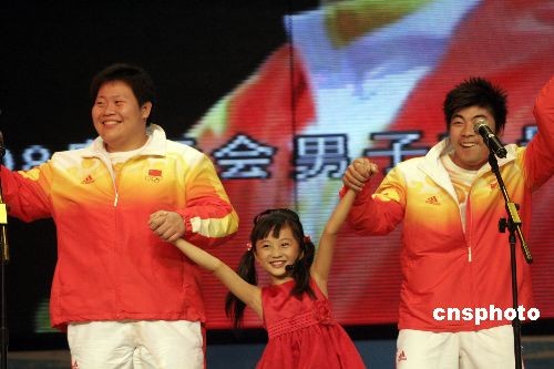 圖:陳?ài)葡、張湘祥等奧運(yùn)冠軍同臺(tái)獻(xiàn)唱