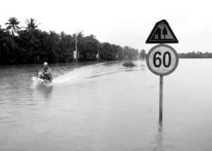 瓊海嘉積鎮(zhèn)多條道路遭受內(nèi)澇。17日下午2時(shí)許,南國都市報(bào)記者徒步趟過3公里積水路段,來到上次受災(zāi)嚴(yán)重的嘉積鎮(zhèn)橋頭村委會(huì)。該村委會(huì)通往嘉積的兩條道路豪華路、嘉博路部分路段積水超過1米。如果不是路邊豎立的路燈,很難分清哪里是道路,哪里是路邊水田。
