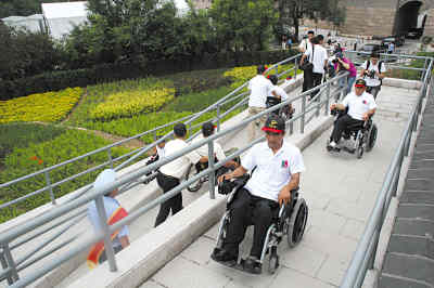 北京殘奧會(huì)的舉辦,對無障礙設(shè)施建設(shè)提出了更高的要求。景區(qū)為幫助殘疾人實(shí)現(xiàn)自主“登長城、做好漢”的愿望,新建了2部無障礙升降平臺(tái)、180米無障礙登城坡道,并對盲道、廁所進(jìn)行了改造,使殘疾游客從下車到登上長城都可以暢行無阻。目前,八達(dá)嶺無障礙設(shè)施已基本涵蓋景區(qū)所有旅游服務(wù)場所。
