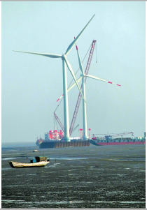 在海上建風電設施面臨不少挑戰(zhàn)。潮間帶風機施工在國內外都無先例可循,在施工過程中,不僅要克服潮汛、臺風等惡劣自然條件的影響,還要解決大型鋼板樁漏水、大型設備的運輸和移位、大噸位風機吊裝等一系列技術難題,同時還面臨協(xié)調工作量大,線路送出距離長等眾多實際困難。江蘇龍源海上項目籌建處克服重重困難,創(chuàng)造性地開展工作,如期實現(xiàn)了首批機組并網(wǎng)發(fā)電。