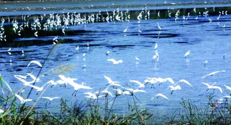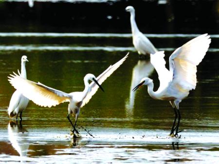 白鷺們聚集的寶地是一塊十余畝的魚(yú)塘。從25日開(kāi)始,魚(yú)塘捕魚(yú)后放水“曬塘”,淺淺地露出了塘底。眼尖的白鷺們一眼就瞅見(jiàn)了漏網(wǎng)的小魚(yú),紛紛呼朋引伴,來(lái)飽餐一頓。大的、小的,公的、母的都趕來(lái)了,一會(huì)兒,千余只白鷺齊聚。