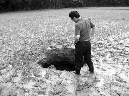 懷遠鎮(zhèn)政府工作人員尹波也證實說,因為插秧子時向田里灌水,泥土經(jīng)過浸泡后引起了地面的塌陷。