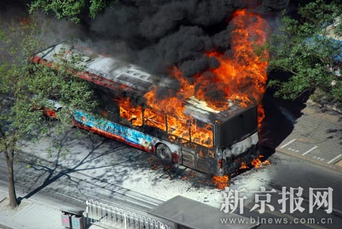 中新網(wǎng)北京7月6日電 (記者 杜燕)北京一輛載有20余名乘客的公交車,于6日早突然起火,幸無人員傷亡。據(jù)稱,由于高溫天氣致油管局部出現(xiàn)火情,造成車輛自燃。