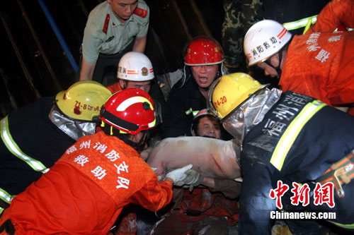 隨著救援進程在加快,一塊塊阻礙救援的鋼筋混凝土樓板和房梁被移開!袄靡簤褐喂ぞ甙褬前鍝纹饋,夾縫里有人!”為避免現場再次塌落,救援官兵利用液壓支撐工具把三樓樓板撐起來。21時55分,消防官兵在現場北面搜又救出1名被埋人員。