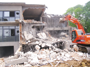 記者上午在現(xiàn)場看到,為了防止意外發(fā)生,不少執(zhí)法隊員都在現(xiàn)場待命,3輛大型挖掘機(jī)伸出鐵爪,猛地將屋面和墻壁敲碎,隨著轟隆隆的倒塌聲,兩幢豪華別墅逐步被肢解,現(xiàn)場塵土飛揚(yáng),鋼筋裸露。一些圍觀的居民感慨地說:“不簡單哪,要不是媒體介入,誰能拆掉這么牛的違建!”到了下午3點多鐘,記者發(fā)現(xiàn)兩幢豪華別墅已經(jīng)從堤壩上消失,現(xiàn)場一片狼藉。