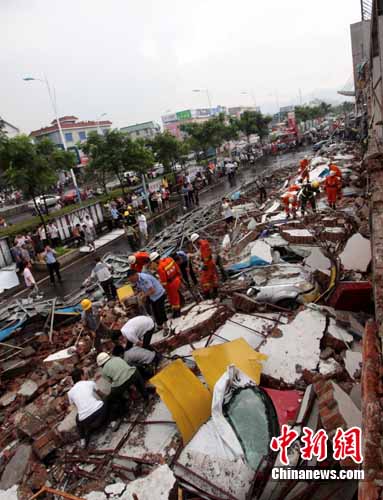 今天下午4點(diǎn)45分,記者趕到現(xiàn)場(chǎng)。發(fā)生事故是巨桑國際家居博覽中心一幢兩層高的樓房,樓房頂部還架有大型廣告牌,此時(shí)該樓房已有約50米長的外墻倒塌,現(xiàn)場(chǎng)已經(jīng)設(shè)置起警戒,公安、消防、醫(yī)院等部門的救援人員及巨桑工作人員等近百人正在倒塌現(xiàn)場(chǎng)全力展開搜救工作,衢州市及柯城區(qū)有關(guān)領(lǐng)導(dǎo)也已趕到現(xiàn)場(chǎng)。
