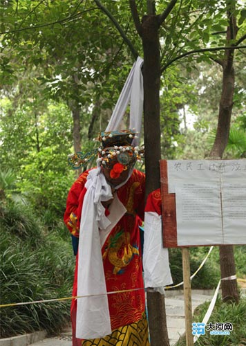 身穿大紅袍,頭戴金冠,脖子套在白布綾挽成的結上。7月23日下午16時許,鄭州市紫荊山公園內一棵大樹下,一男子扮成一“財神爺”模樣欲“上吊”尋短見討回農民工血汗錢。