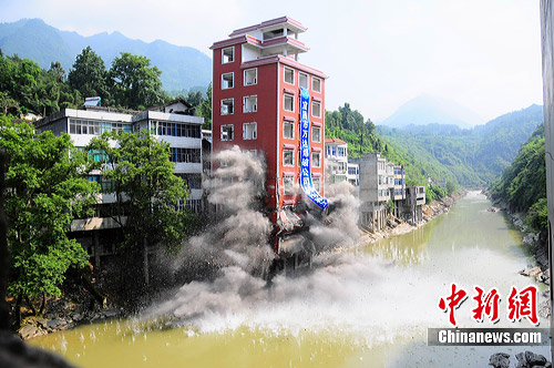 爆破既不能損壞連體的4層樓房,又不能長(zhǎng)時(shí)間堵塞河道,倒塌距離必須嚴(yán)格控制在20米以?xún)?nèi),技術(shù)要求高。工程施工方采取定向爆破和原地爆破兩種方式同時(shí)進(jìn)行,安裝了60公斤炸藥對(duì)房屋實(shí)施爆破拆除,此次爆破非常成功,被網(wǎng)友稱(chēng)為“最!钡暮又羞`章建筑終于強(qiáng)拆。
