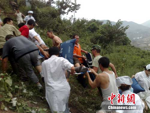 由于出事地點地形十分險要,公路離崖底大約有30米的垂直距離,根本無路可下,情況十分危急,當?shù)卮迕竦膮f(xié)助下找來鋤頭、鐵鍬迅速打開了一條臨時“生命通道”,趕到現(xiàn)場救援的消防官兵帶上破拆工具鉆進車內(nèi)搜救幸存者,傷者被找到并用腰帶將傷者固定在擔架上,在當?shù)卮迕窈偷膮f(xié)助下,用接力的方式抬著擔架,將傷者抬上路面,并立即送往縣內(nèi)各大醫(yī)院進行急救。趕到現(xiàn)場的醫(yī)務(wù)人員判斷,車內(nèi)有一些已無生命跡象。