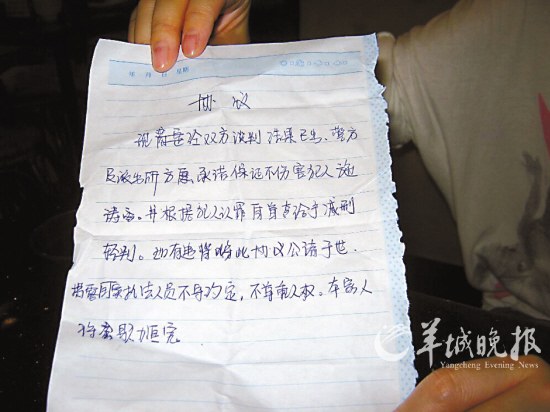 過了半個小時之后,施某提出要吃東西!八呀浫鞗]有吃東西,三天來他從沒下過樓,想起來我就心疼。”于是施麗佳下樓買了兩個盒飯帶上去了!霸谶@段時間,我勸他:警察殺你很簡單,為什么不投案自首呢?如果自首他們會保證你的安全,如果你不放心,我們可以和他們簽一份協(xié)議。”施麗佳向記者出示當時協(xié)議的草稿,據施麗佳稱,協(xié)議的主要內容為施某投案自首,警察保證他的安全,并根據自守的情節(jié)向法院求情。