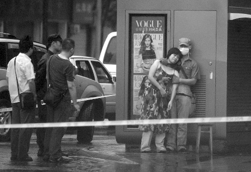 歹徒背靠書(shū)報(bào)亭,站在屋檐下,右手持刀抵住女人質(zhì)的脖子,左手牢牢拽住后者的手臂。警方隨即在現(xiàn)場(chǎng)拉起警戒線,為避免刺激歹徒的情緒,又及時(shí)疏散了圍觀的群眾。