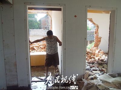 記者在現(xiàn)場(chǎng)看到,這幢樓房里一片空蕩蕩的,多數(shù)人家已經(jīng)搬走。不少住戶的門窗全部被拆掉,部分圍墻被推倒。東邊的山墻,被砸出兩個(gè)大比門窗面積還大的 “洞口”。走進(jìn)樓梯口,記者發(fā)現(xiàn),部分樓梯已經(jīng)被切割掉,多層樓板的水泥被砸掉,裸露出一塊塊鋼筋網(wǎng)。儼然,這幢樓房已經(jīng)成一座危樓。