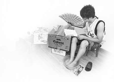 小韓說(shuō),自己與同學(xué)發(fā)明了一套“泡腳”消暑法,每當(dāng)晚上酷熱難當(dāng)時(shí),便每人接上滿滿一桶涼水,把雙腿完全泡在其中,泡腳的同時(shí)還可以看書(shū)、上網(wǎng),感覺(jué)非常涼爽。