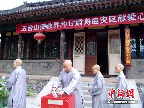 當(dāng)甘肅舟曲泥石流災(zāi)害的消息傳到五臺(tái)山時(shí),再次揪疼了五臺(tái)山僧眾的心。為幫助受災(zāi)群眾順利重建家園,身在佛門(mén)心系天下蒼生的他們,不論是黃廟的,還是青廟的,不論貧富,不分遠(yuǎn)近的大大小小的40多處寺廟和近千個(gè)四眾弟子,以同樣真切和濟(jì)世之情,共同援手,在不到一個(gè)小時(shí)的時(shí)間里,捐款數(shù)達(dá)到了53.6380萬(wàn)元人民幣,其中普壽寺捐款10萬(wàn)元,萬(wàn)佛閣6萬(wàn)元,塔院寺5.5萬(wàn)元、普化寺5萬(wàn)元,其它寺院均盡自己的力量出資捐助。目前,善款已轉(zhuǎn)交有關(guān)部門(mén),但捐款活動(dòng)仍在繼續(xù)進(jìn)行。