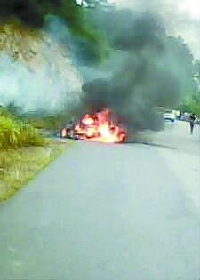 當(dāng)車隊(duì)開到余姚梁弄的一條鄉(xiāng)鎮(zhèn)公路上時(shí),其中一輛法拉利跑車車后的發(fā)動(dòng)機(jī)突然冒出了大量濃煙。隨后整個(gè)車子開始熊熊燃燒,不到半個(gè)小時(shí)就燒得只剩下個(gè)底盤框架,幸虧發(fā)現(xiàn)及時(shí),沒有人員傷亡。