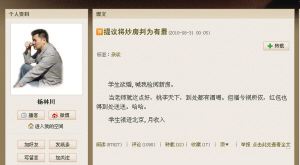 在楊林川8月31日發(fā)表的這篇博文里,他寫(xiě)到,北京的一個(gè)學(xué)生要結(jié)婚,新房設(shè)備一應(yīng)俱全,卻沒(méi)有裝潢,因?yàn)椤白鈦?lái)的房子,隨時(shí)都要搬家,裝潢沒(méi)用!睂W(xué)生小兩口月收入近一萬(wàn),房租2800元、生活費(fèi)1500元,加上交通費(fèi)、水電費(fèi)等各種開(kāi)支每月6100元。如果不生孩子,不生病,不出意外,每月可以節(jié)余3500元,存十年才40多萬(wàn)元,等兩人都退休了,也只能攢夠買(mǎi)廁所、廚房和客廳的錢(qián)。此后,楊林川又碰見(jiàn)一位房地產(chǎn)記者,當(dāng)問(wèn)到房?jī)r(jià)為什么這樣高,記者說(shuō)都是讓炒房團(tuán)鬧的,他們和開(kāi)發(fā)商聯(lián)起手來(lái),狼狽為奸。