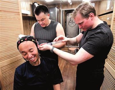 王躍(左一)在模擬艙內(nèi)進(jìn)行腦電極試驗(yàn)。俄羅斯生物醫(yī)學(xué)問(wèn)題研究所供圖