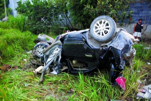 昨日凌晨,四川閬中市巴都大道發(fā)生一起車禍,一輛小轎車越過37米寬的稻田飛上二樓,將居民住房撞了一個直徑約1米的大窟窿。據(jù)圍觀的士司機(jī)介紹,小轎車能飛越37米寬的稻田,時速至少在每小時180至200公里以上。
