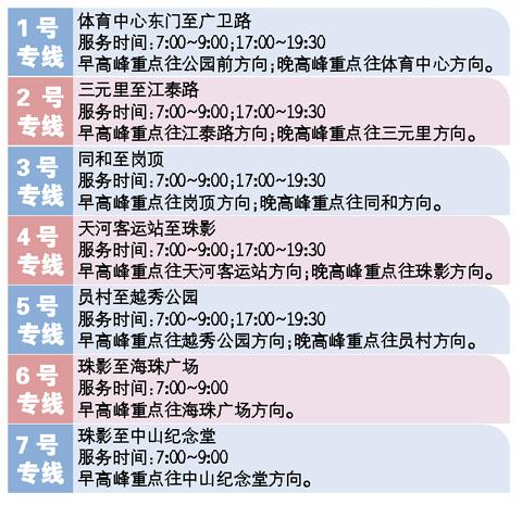 從今天起,(廣州)市民搭乘公交地鐵不再免費(fèi),相關(guān)交通補(bǔ)貼該如何發(fā)放,政府相關(guān)部門正在研究制定,以確保符合條件的每個(gè)家庭和個(gè)人都能享受到。記者昨天從廣州市交委獲悉,為進(jìn)一步方便市民出行,從今天起,交通部門將在上下班高峰期增開7條公交專線,分別與地鐵一號(hào)線、二號(hào)線、三號(hào)線、五號(hào)線、八號(hào)線等一些客流量集中的地鐵線網(wǎng)區(qū)段平行走向。