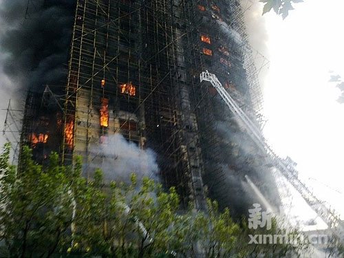 16時(shí)20分,大火持續(xù)了兩個(gè)多小時(shí)還未被撲滅,大樓內(nèi)仍有居民尚未逃出,頂樓還有不少被困居民在等待救援。新民網(wǎng)記者在現(xiàn)場(chǎng)看見,經(jīng)過大火猛烈的炙烤,已經(jīng)有腳手架在往下掉落了,現(xiàn)場(chǎng)十分危險(xiǎn)。
