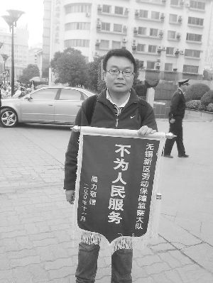 其實我一共做了三面錦旗。最早的一面9月份做的“起訴通用工會法院不受理”,給無錫新區(qū)法院的!安粸槿嗣穹⻊(wù)”是給勞動保障監(jiān)察大隊的。第三面還是給法院的,寫的“行政訴訟立案難”,還沒送出去,F(xiàn)在看來第二面最受歡迎。