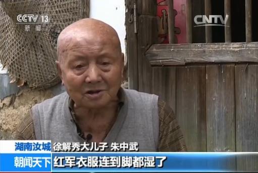 徐解秀大兒子朱中武:我媽媽看到這個(gè)天氣下雪下雨,紅軍衣服都濕了,進(jìn)屋來就趕快燒起水給她們洗腳、洗澡,燒好水以后就煮飯給她們吃。