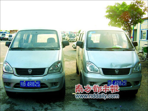 昨天下午4點鐘,羅湖交警大隊西嶺下扣車場,丁先生的車和套牌車停在一角!斑@簡直就是孿生的嘛”,一位車場工作人員這樣說,兩輛車同為哈飛面包車,車型完全相同,顏色同為銀灰色。