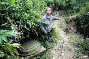 “竹子一砍掉后,一個巨大的房柱石地盤就露了出來,顏色有些發(fā)青。坍塌的坑里有很多青瓦。”