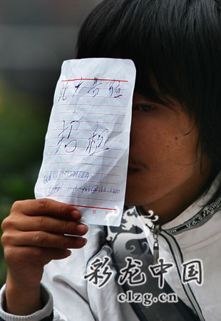 羞澀的表情,略亂的頭發(fā),穿一身白色衣服,旁邊擺一個(gè)旅行包。這個(gè)臉上還有著稚氣的小伙子,用蹩腳的普通話指著紙上的字,有些不好意思地說:“寫得很不好。”手舉一張紙遮住臉,上面是他自己用鋼筆寫的“此廣告位出租”6個(gè)大字,右下角留的小字標(biāo)有自己的QQ號(hào)和電子郵址。