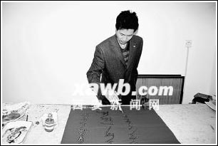 據(jù)王璽介紹,他自幼酷愛書法,2004年在西安學(xué)習(xí)期間,參加了由省政協(xié)組織的書畫活動(dòng),他見書畫名家雷長(zhǎng)安表演的書法針筆運(yùn)筆剛?cè)嵯酀?jì),結(jié)字嚴(yán)謹(jǐn)多變,布局渾然大氣,風(fēng)格酣暢灑脫,便產(chǎn)生了針書創(chuàng)作的念頭。今年,他積極摸索,利用醫(yī)療器械注射器作為工具作筆寫字,將調(diào)和的裝飾材料溶液吸到針管里,蘸到“筆尖”上,使金墨銀墨在深色宣紙上流動(dòng)成為書法作品,如同毛筆在生宣紙上寫字一樣有節(jié)奏、有韻律,極具觀賞性。 (記者張松)