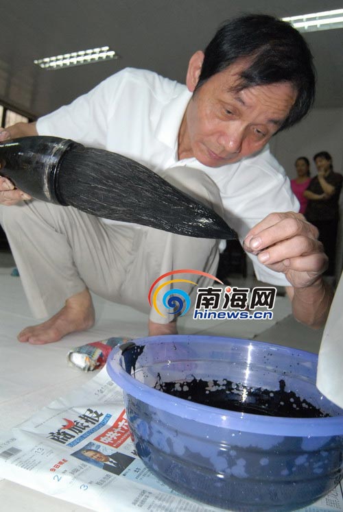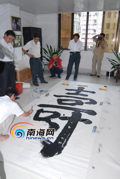 今天下午4時(shí)許,在?谑形乃嚶(lián)合會(huì)會(huì)長(zhǎng)的辦公室里,余廣老先生先先是拿出他在家里練筆的大壽字向在場(chǎng)的記者們展示。展示完后,余老先生拿出自已帶來(lái)的筆和紙。在地上鋪上一張長(zhǎng)達(dá)3.7米,寬為1.47米白紙,將白紙整平后,余老先生開(kāi)始調(diào)墨,在文聯(lián)工作人員的幫助下,余先生揮起自己帶來(lái)的大毛筆,仔細(xì)整理毛筆后,余老先生在白紙開(kāi)始揮舞,不用一會(huì)兒功夫,一個(gè)大形楷書(shū)壽字就寫(xiě)成,在場(chǎng)的人給予了熱烈掌聲。(記者汪德芬)