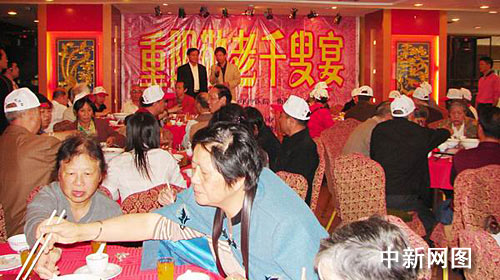 中午,出游歸來(lái)的千名老人又相聚在王府酒樓參加“千叟宴”,舉杯共慶“重陽(yáng)節(jié)”。席間但看壺中酒,杯杯先敬老年人。衡陽(yáng)市長(zhǎng)彭崇谷在盛宴開(kāi)始后,舉杯向老人們敬酒。席間,主辦方還朗誦了清朝康熙皇帝在陽(yáng)春園第一次舉行千人大宴中席賦的《千叟宴》詩(shī)一首,博得老人們的陣陣掌聲。今年已80高齡的鄭仲儀老人飲了兩杯酒后,興奮不已,對(duì)記者說(shuō),自己還從來(lái)沒(méi)有與這么多的老年人一同赴宴,能參加這樣的盛宴,不管吃什么自己都覺(jué)得很開(kāi)心。回去后將告訴兒孫們,要把中華民族敬老愛(ài)幼的傳統(tǒng)美德一代一代傳承下。