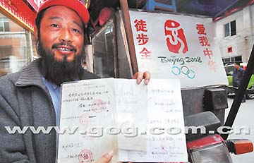10月21日下午,“徒步中國(guó),宣傳奧運(yùn)”的湖北宜都人李春華在貴陽(yáng)河濱公園,向記者展示國(guó)家奧組委和他所到地區(qū)政府給他的題詞以及加蓋的公章。今年45歲的李春華,2000年12月26日從云南西雙版納開始實(shí)施自己多年的夢(mèng)想,徒步全國(guó),宣傳奧運(yùn)。七年間,李春華歷經(jīng)風(fēng)雨和苦難,足跡遍及大半個(gè)中國(guó),預(yù)計(jì)23日從貴陽(yáng)離開前往云南,走完這一行的最后一段。