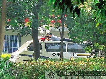 當(dāng)日上午9時(shí)15分,記者在南寧市第八人民醫(yī)院內(nèi)見到,醫(yī)院籃球場(chǎng)南側(cè)一片樹林里,一頭水牛正站在樹間吃草,籃球場(chǎng)邊?恐鴥奢v警車,有持槍民警在附近警戒。
