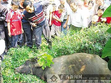 10月21日,一頭水牛被牽進(jìn)南寧市明秀西路細(xì)新巷時(shí),受驚奔走,接連撞倒1男3女后,竄進(jìn)了南寧市第八人民醫(yī)院內(nèi)一片樹林里。上午10時(shí)47分,一聲槍響,水牛被民警擊斃。