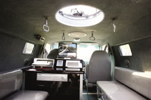 “除了功能上的特殊性,這輛車還裝備了很多高科技裝備!”張國強介紹說,除駕駛員外,這輛全封閉的車子可以搭載12名突擊隊員,但這樣一來,換氣就成了問題。所以,在該車中部天窗附近,還增設了一處特制的換氣扇,保證了車內(nèi)充足的氧氣量;其次,該車還配備了特制的逆變電源,就算是車子在停止狀態(tài),通過這種特殊的設備,12伏的電壓也能在瞬間轉(zhuǎn)變?yōu)?20伏電壓,以保證車內(nèi)電腦、監(jiān)控屏幕等電子設備正常工作。