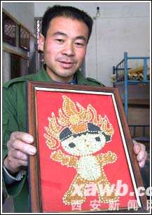 據(jù)陳群虎介紹,一次偶然的機會,他從雜志上看到一篇報道,北京有人用五谷雜糧經(jīng)過處理以后做出了衣服,他想既然能用糧食做衣服,也就能用糧食寫字作畫。隨后,陳群虎便放下手頭的工作,專門來創(chuàng)作他的五谷字畫。經(jīng)過半年多的研究學(xué)習(xí)和嘗試,陳群虎終于成功創(chuàng)作出了具有濃濃鄉(xiāng)土氣息的“五谷字”。他的作品全都是用草籽、糜子、豆子谷物制作而成,字畫中的顏色也都是用這些顏色各異的谷物搭配成的。他作畫時用的工具都是在果樹嫁接時用的嫁接刀、鑷子、鋸等。陳群虎告訴記者,現(xiàn)在已經(jīng)有不少作品被鄉(xiāng)親們收藏了,這給了他極大的鼓舞和激勵,他將一直創(chuàng)作下去。(記者 張海鵬文/圖)