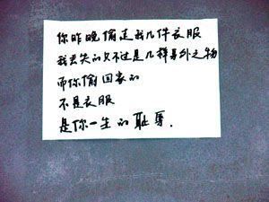 孫女士說,她看了紙上的幾行字后,不知何故,詢問后得知,原來鄰居何女士前天晚上將孩子的衣服洗完后,晾在門外的胡同里,夜里忘了收回來,第二天早上出門一看,幾件較好的衣服全不見了。何女士又氣又郁悶,便想寫一首小詩來抒發(fā)憤懣的心情!拔疫@個鄰居是一家公司的職員,喜歡文學,平時總愛寫幾首小詩抒發(fā)情感!睂O女士說。