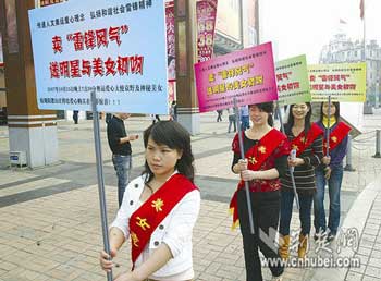 昨日下午,在漢口中山大道大洋百貨附近,4名女青年高舉著印有“賣雷鋒風(fēng)氣,送明星與美女初吻”的宣傳牌,牌上還有“傳遞人文奧運愛心理念,弘揚和諧社會雷鋒精神”等小字,引得不少路人圍觀。