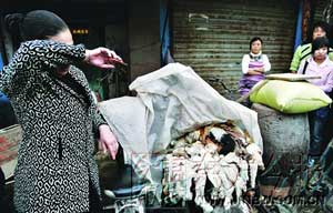 昨天17時(shí)30分,記者來到慶豐市場(chǎng),這里有個(gè)活雞活魚專賣區(qū)。就在這里,記者剛好碰上了殺狗商販的交易。