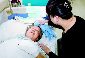 10月25日12時30分,記者在自治區(qū)中醫(yī)院骨三科見到了楊老太,老人臉上布滿血痂,右眼白已全部變成紅色,左手被白布包裹著不能動彈。