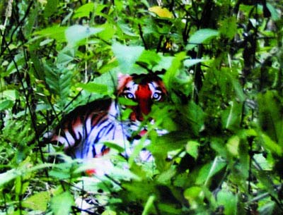 這是周正龍用數(shù)碼相機(jī)拍攝的第24張野生華南虎照片,也是整組照片中成像最好的一張(局部裁剪圖)