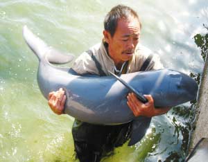 昨天上午,膠南市開發(fā)區(qū)管委兩河村村民王先生到海邊買魚時(shí),發(fā)現(xiàn)漁船捕撈上來的一條1米多長(zhǎng)的小海豚被一魚販買去,聽到該魚販要將海豚轉(zhuǎn)賣給酒店時(shí),王先生立即出千元高價(jià)將這條海豚買回,然后養(yǎng)在自家的蝦池里準(zhǔn)備放生。昨天上午11時(shí),在膠南市漁政部門的見證下,這條小海豚被放歸大海。